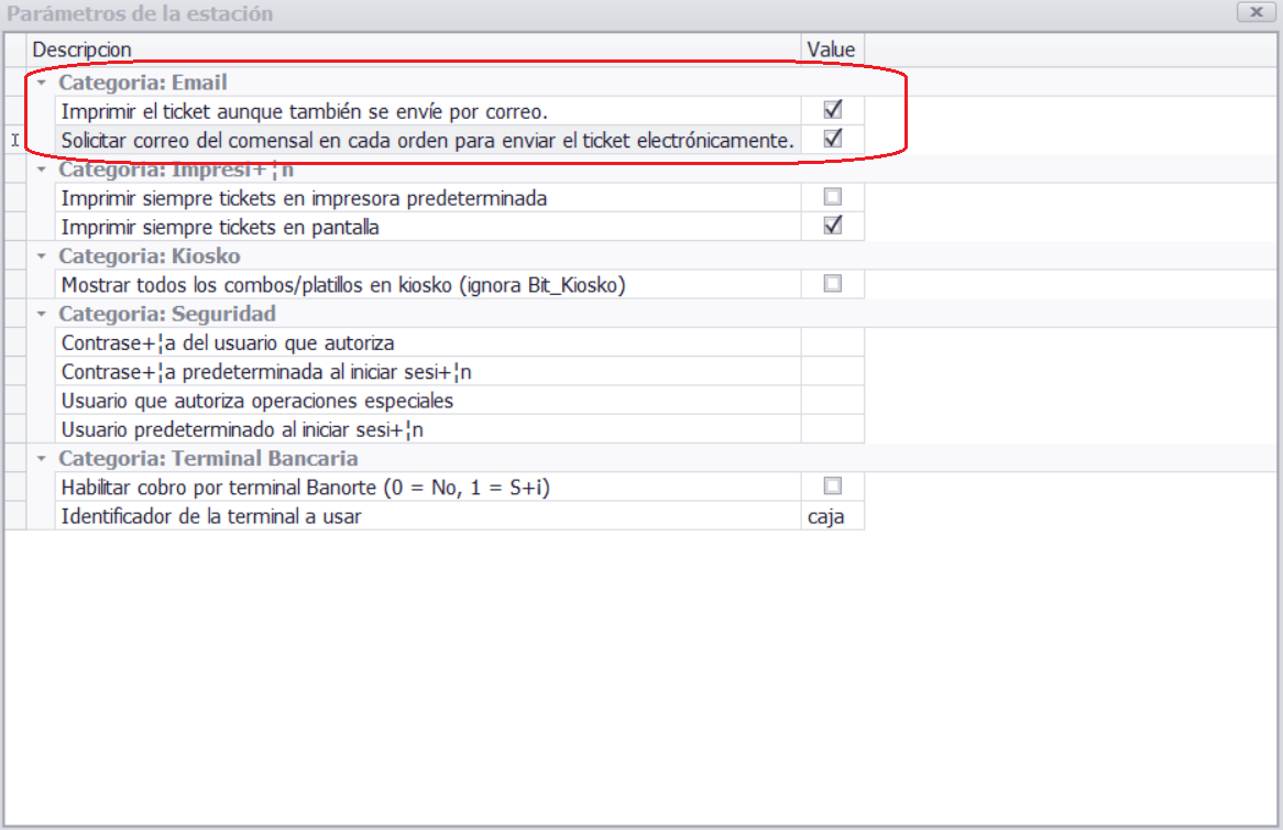 Dentro de la pestaña de Configuración en la opción de Parámetros de estación existe una categoría llamada Email que contiene dos configuraciones principales relacionadas con el envío de tickets electrónicos: