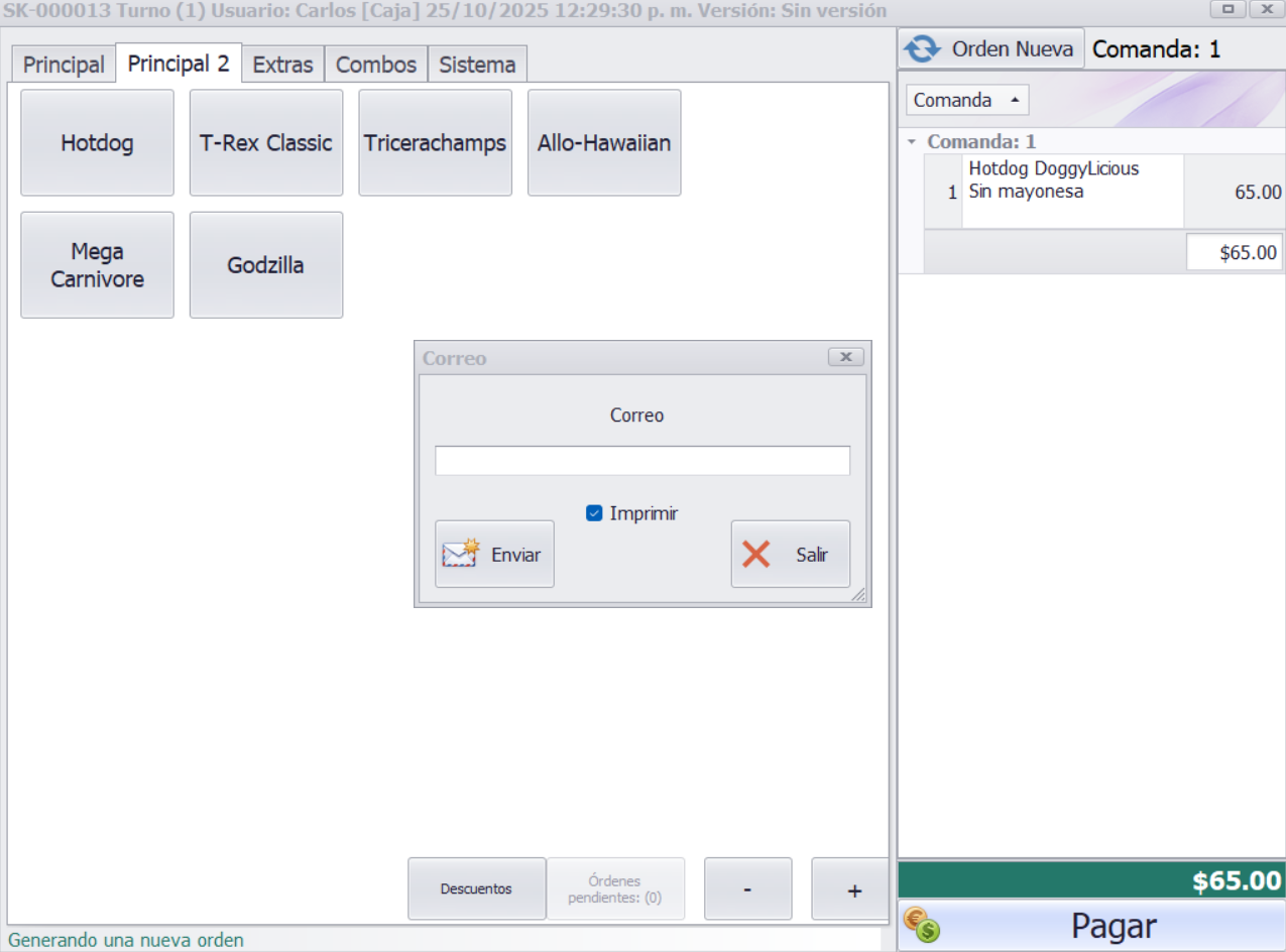 - Solicitar correo del comensal en cada orden: al habilitar este parámetro, el sistema mostrará una pantalla emergente al finalizar o generar una orden, solicitando el correo electrónico del cliente para enviarle el ticket digital.
