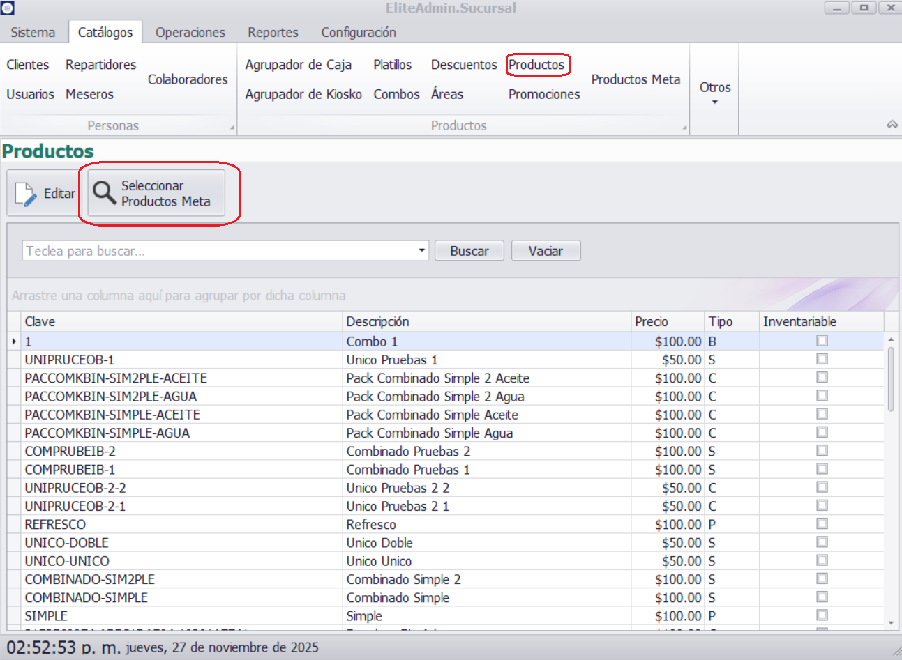 Una vez guardados, los productos aparecerán en la tabla principal del catálogo.