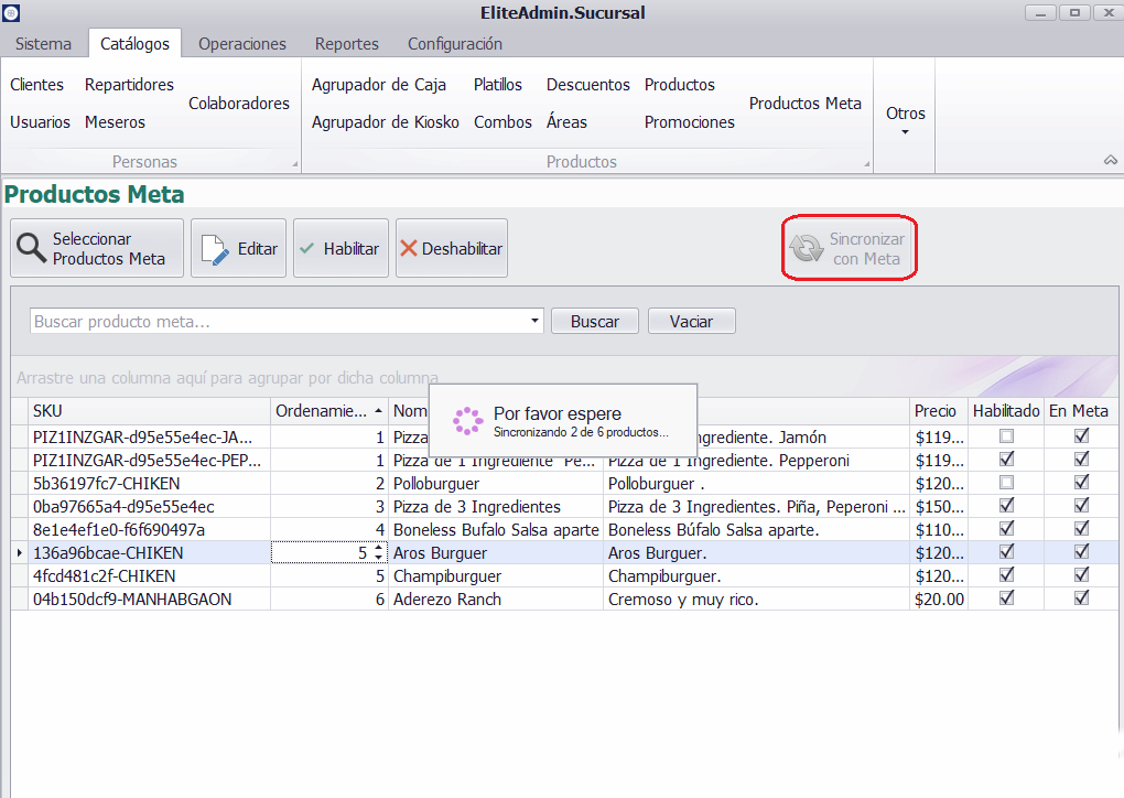Los botones Habilitar y Deshabilitar permiten activar o desactivar un producto dentro del catálogo Meta.